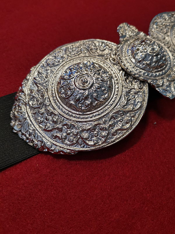 •   Πόρπη - ζώνη από μπρούτζο και διαστάσεις : 21 cm x 8 cm , με ανάγλυφα-σκαλιστά σχέδια και με λάστιχο ενός (1) μέτρου .
