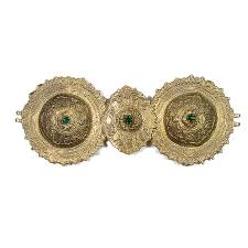 Πόρπη - ζώνη από μπρούτζο και διαστάσεις : 20 cm x 8.5 cm , με ανάγλυφα-σκαλιστά σχέδια και τρεις πράσινες πέτρες . Με λάστιχο ενός (1) μέτρου