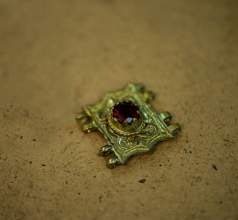 Κεντρικό μοτίφ από μπρούτζο , διακοσμημένο με μία πέτρα , καρφωμένη στο χέρι (όχι κολλημένη) . Διαστάσεις : 2,5 εκ. Χ 2 εκ.