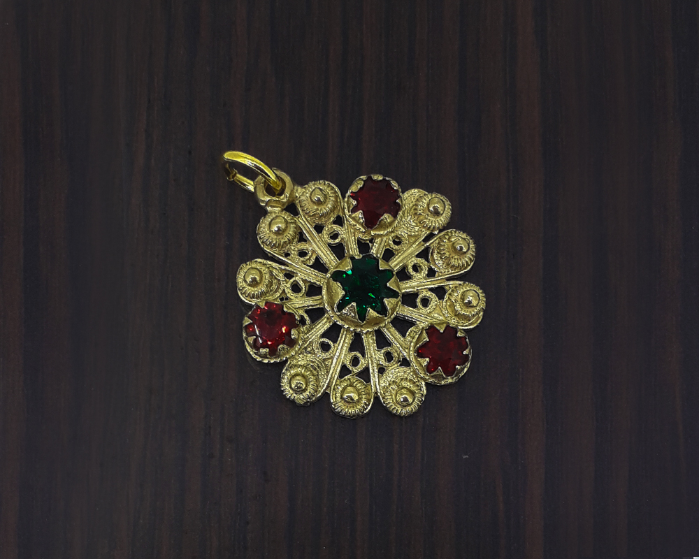 Μαργαρίτα - μενταγιόν παραδοσιακό από μπρούτζο , με κρίκο και τρεις πέτρες , καρφωμένες στο χέρι (όχι κολλημένες) .