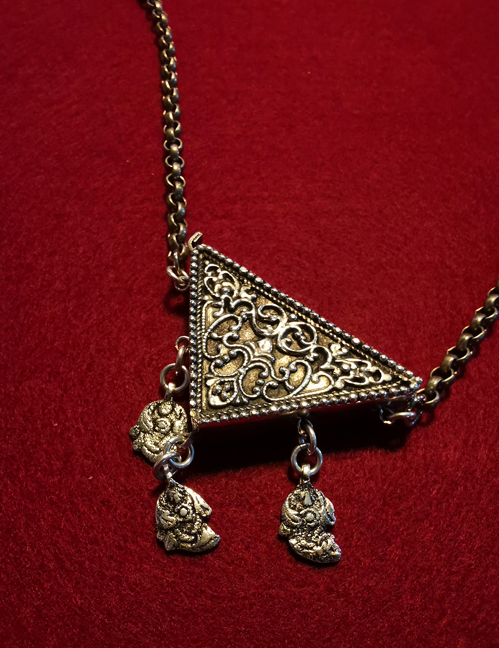 Τρίγωνο φυλαχτό Αη-Γιώργης από μπρούτζο , διακοσμημένο με τρία μοτίφ . Στην μπροστινή όψη αναπαριστάται ο Άγιος Γεώργιος και στην πίσω υπάρχουν σκαλιστά σχέδια . Μπορεί να ανοίξει και να μπει φυλαχτό . Μήκος αλυσίδας : 1 μέτρο .
